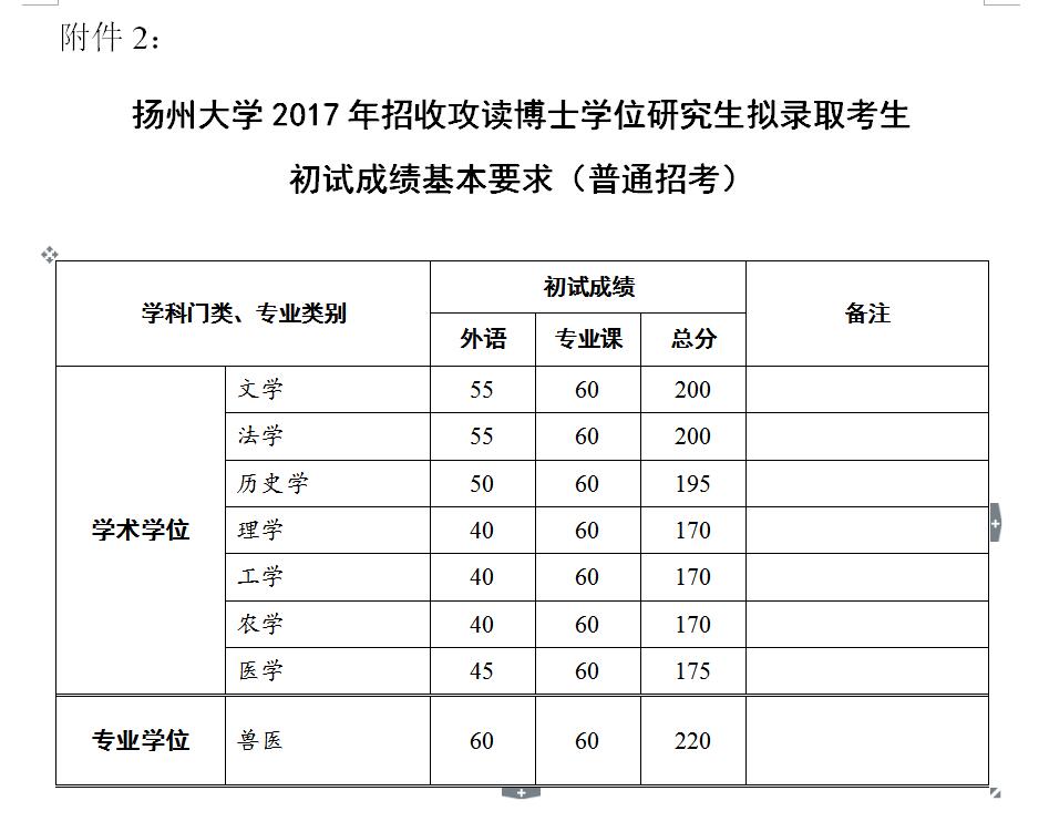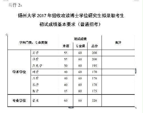 根据《教育部办公厅关于做好2017年招收攻读博士学位研究生工作的通知》(教学厅〔20172号)、《扬州大学博士研究生招生管理办法(试行)》(扬大研院〔201520号)及江苏省2017年研究生招生录取工作会议精神,结合我校实际情况,现就我校2017年博士研究生招生录取工作提出如下意见: